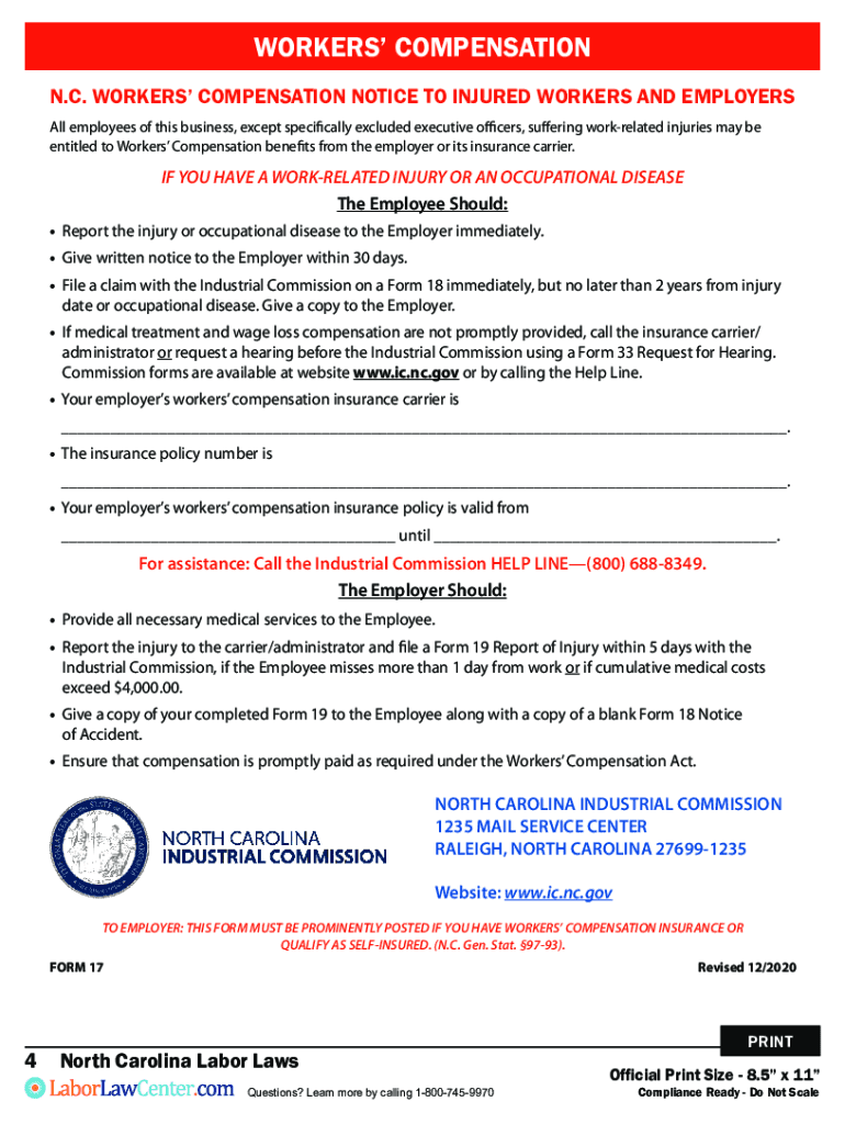 WORKERS COMPENSATION N.C. WORKERS COMPENSATION NOTICE TO INJURED WORKERS AND EMPLOYERS All employees of this business, except specifically excluded executive officers, suffering work related injuries