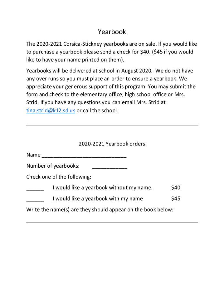 Yearbook The 20202021 CorsicaStickney yearbooks are on sale. If you would like to purchase a yearbook please send a check for $40. ($45 if you would like to have your name printed on them). Yearbooks