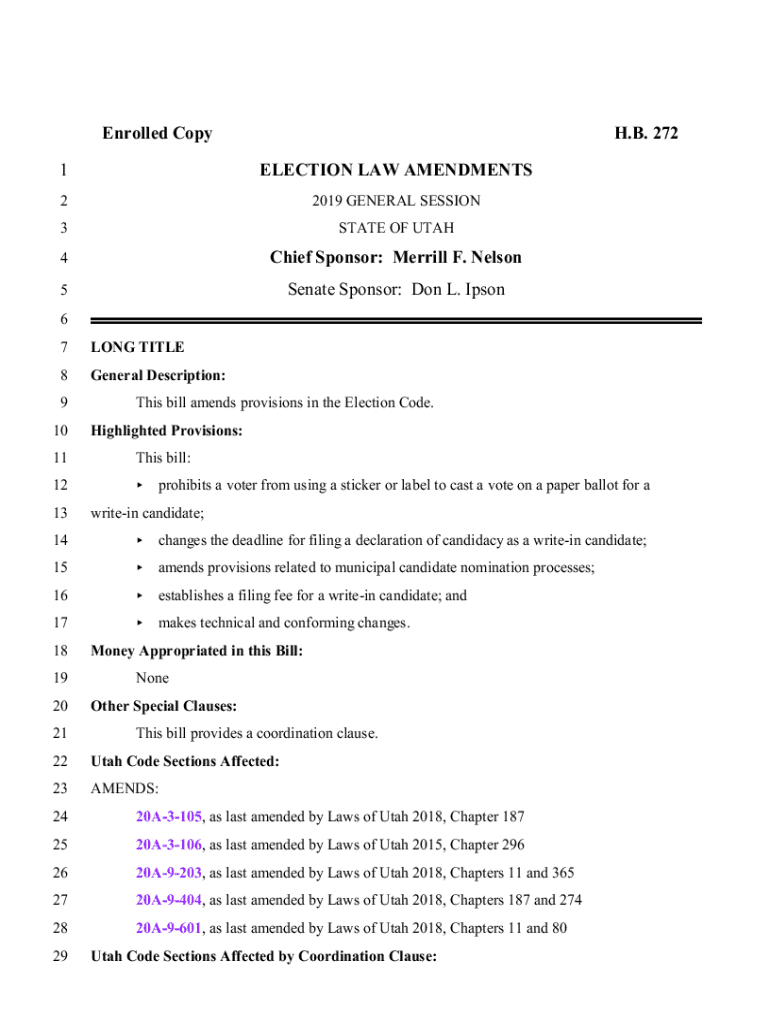 Enrolled Copy. B. 2721ELECTION LAW AMENDMENTS22019 GENERAL SESSION3STATE OF UTAH4Chief Sponsor: Merrill F. Nelson5Senate Sponsor: Don L. Ipson6 7LONG TITLE8General Description:9This bill amends provisions