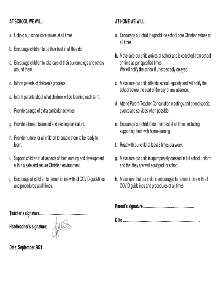 AT SCHOOL WE WILL:AT HOME WE WILL:a. Uphold our school core values at all times.a. Encourage our child to uphold the school core Christian values at all times.b. Encourage children to do their best
