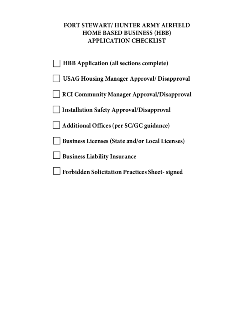 FORT STEWART/ HUNTER ARMY AIRFIELD HOME BASED BUSINESS (HUB) APPLICATION CHECKLIST HUB Application (all sections complete) USAGE Housing Manager Approval/ Disapproval RCI Community Manager Approval/Disapproval