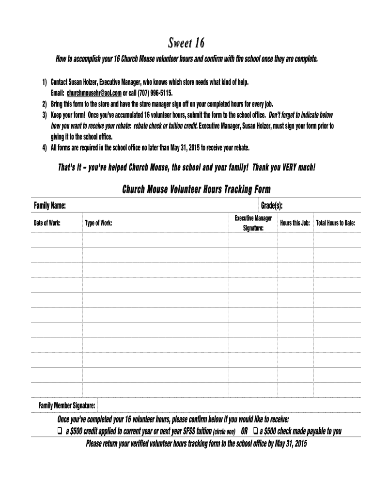 How to accomplish your 16 Church Mouse volunteer hours and confirm with the school once they are complete.