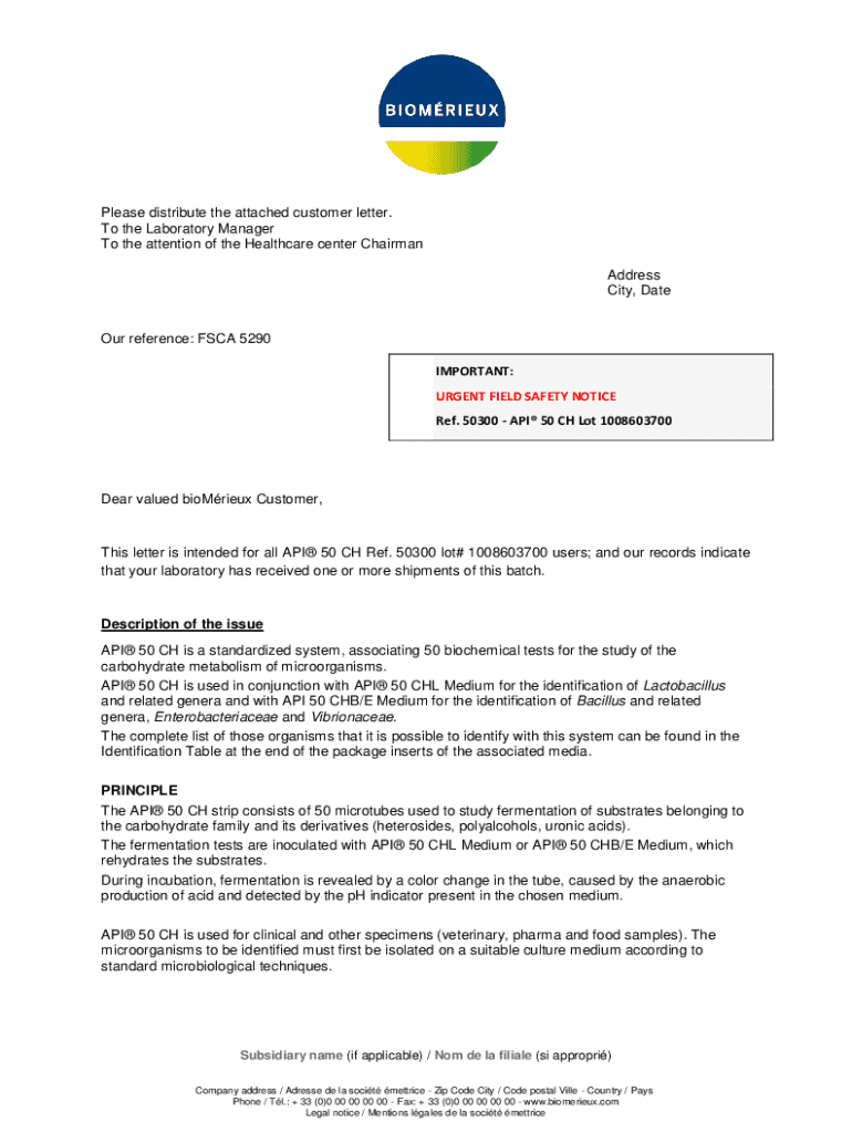 Please distribute the attached customer letter. To the Laboratory Manager To the attention of the Healthcare center Chairman Address City, Detour reference: FSA 5290 IMPORTANT: URGENT FIELD SAFETY