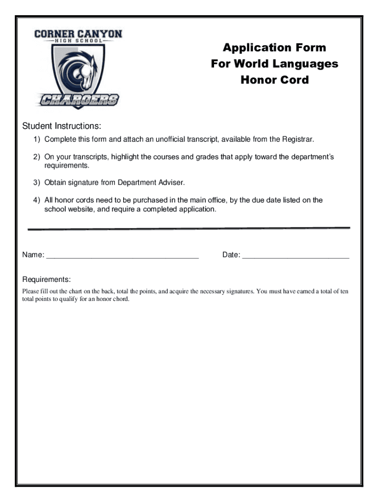 Application Form For World Languages Honor CordStudent Instructions: 1) Complete this form and attach an unofficial transcript, available from the Registrar. 2) On your transcripts, highlight the