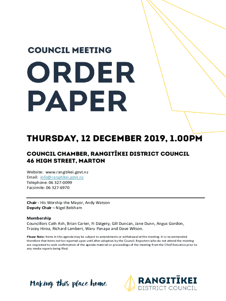 THURSDAY, 12 DECEMBER 2019, 1.00pm *0)$\'#(W)\”$/& $$./$/*0)$\' 46 High Street, Martin Website: www.rangitikei.govt.nz Email: info@rangitikei.govt.nz Telephone: 06 3270099 Facsimiles: 06 3276970