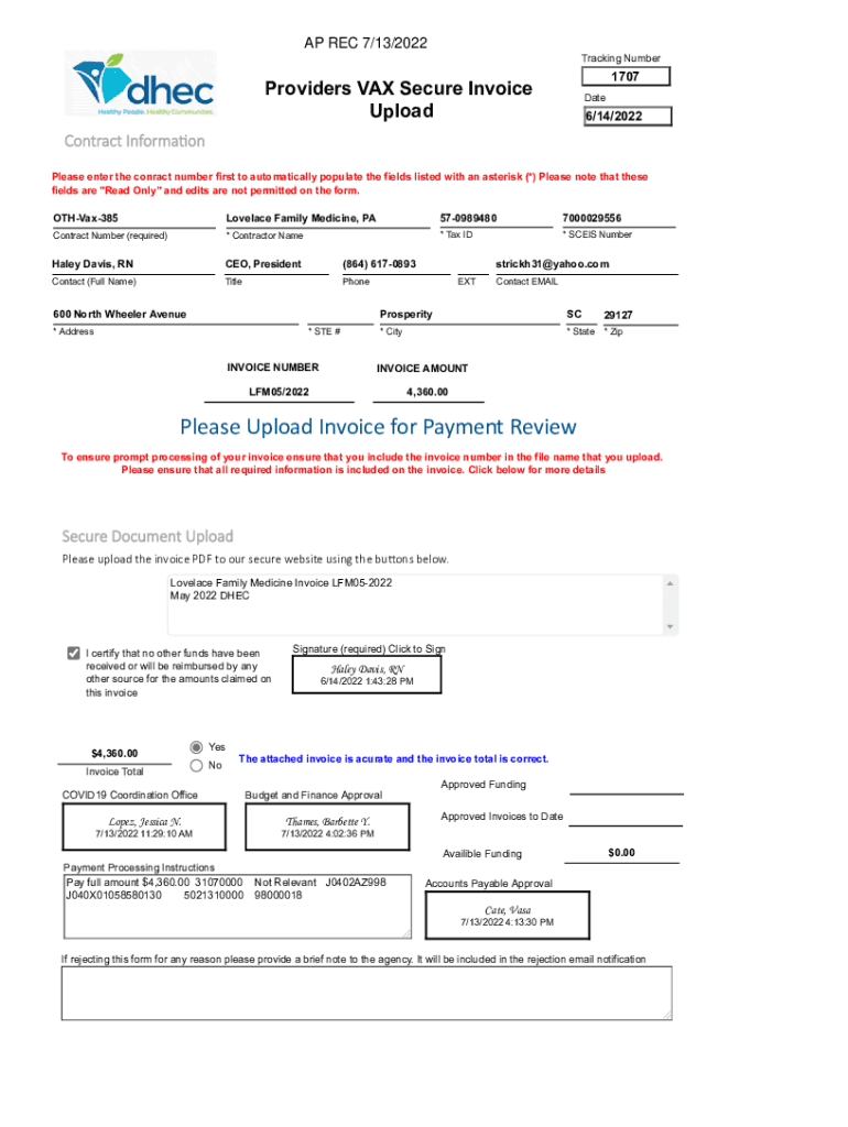 AP REC 7/13/2022 Tracking Number1707Providers VAX Secure InvoiceUploadDate6/14/2022Contract Information Please enter the contract number first to automatically populate the fields listed with an asterisk
