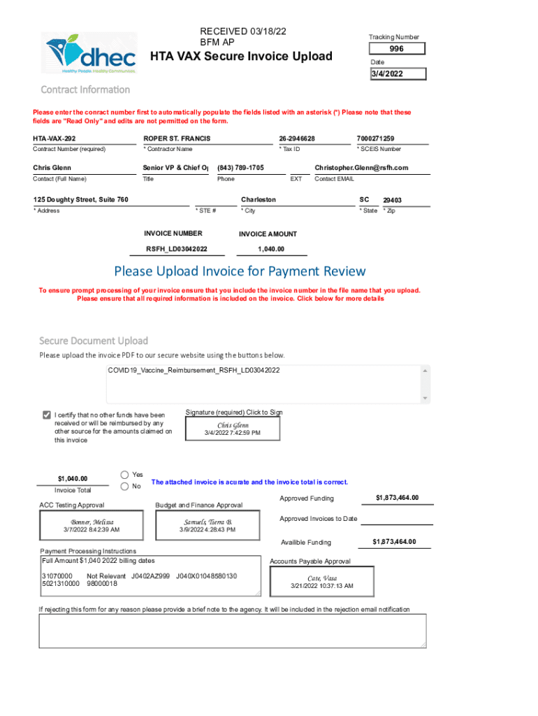 RECEIVED 03/18/22 BFM APT racking Number996HTA VAX Secure Invoice UploadDate3/4/2022Contract Information Please enter the contract number first to automatically populate the fields listed with an