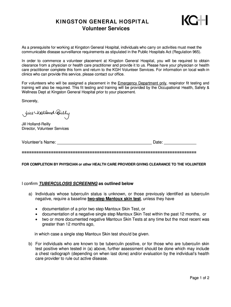KINGSTON GENERAL HOSPITAL Volunteer Services As a prerequisite for working at Kingston General Hospital, individuals who carry on activities must meet the communicable disease surveillance requirements