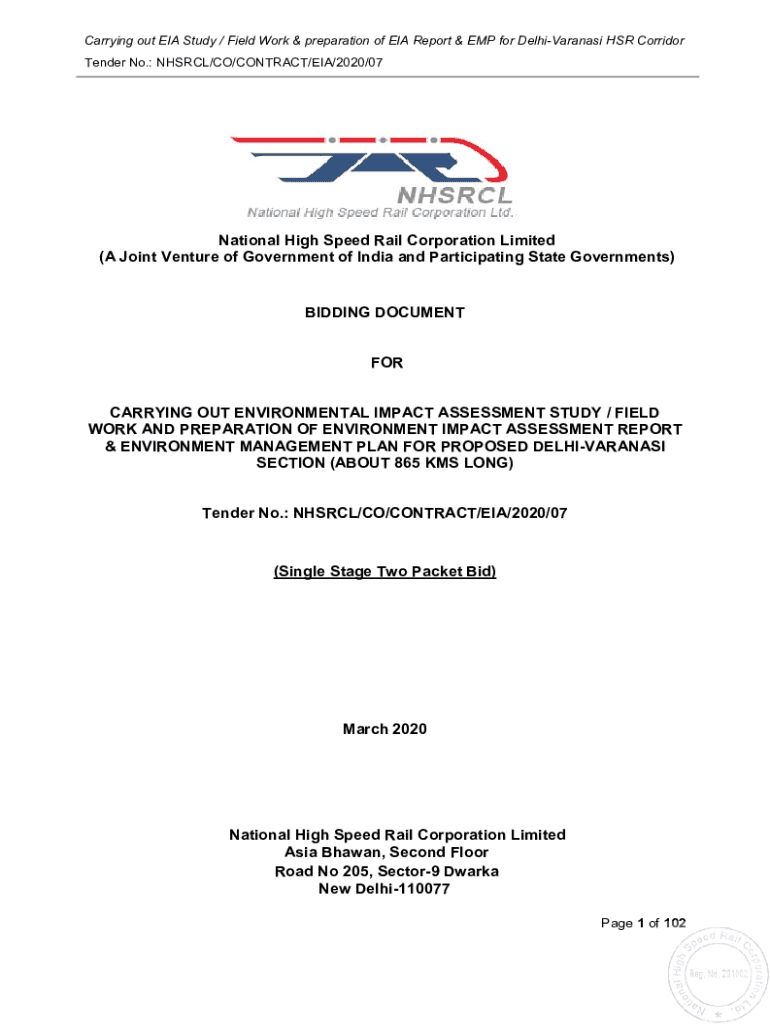 Carrying out EIA Study / Field Work & preparation of EIA Report & EMP for Delhi Varanasi HER Corridor Tender No.: CHURCH/CO/CONTRACT/EIA/2020/07National High Speed Rail Corporation Limited (A Joint
