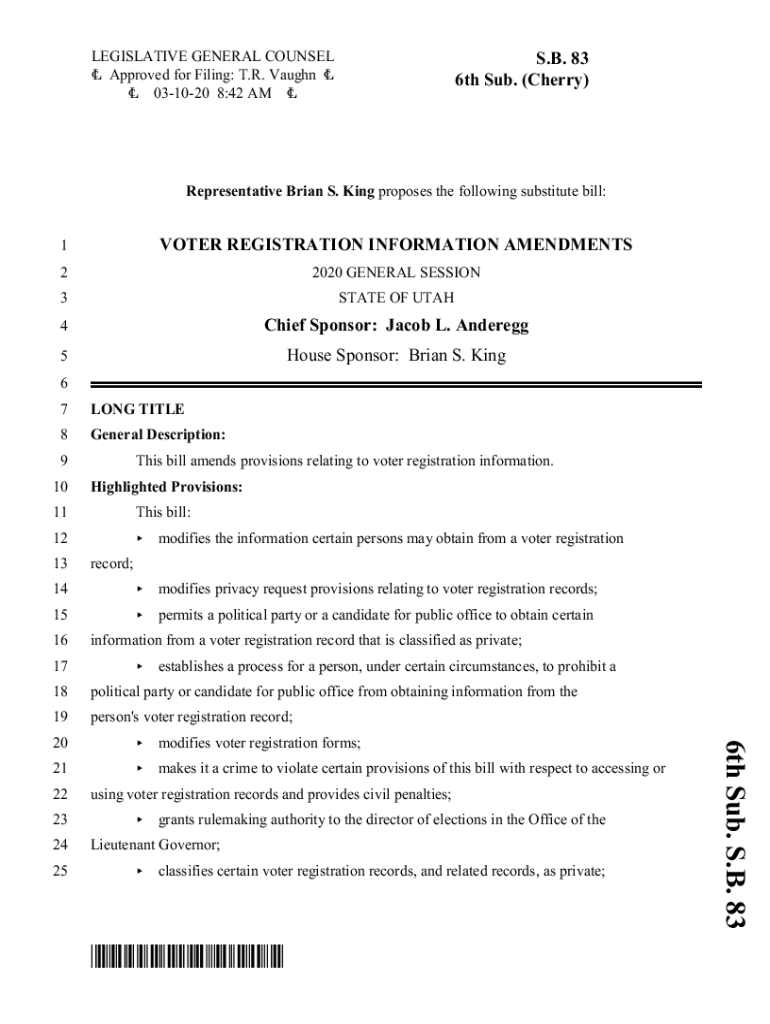 LEGISLATIVE GENERAL COUNSEL 6 Approved for Filing: T.R. Vaughn 6 6 031020 8:42 AM 6S. B. 83 6th Sub. (Cherry)Representative Brian S. King proposes the following substitute bill:1VOTER REGISTRATION