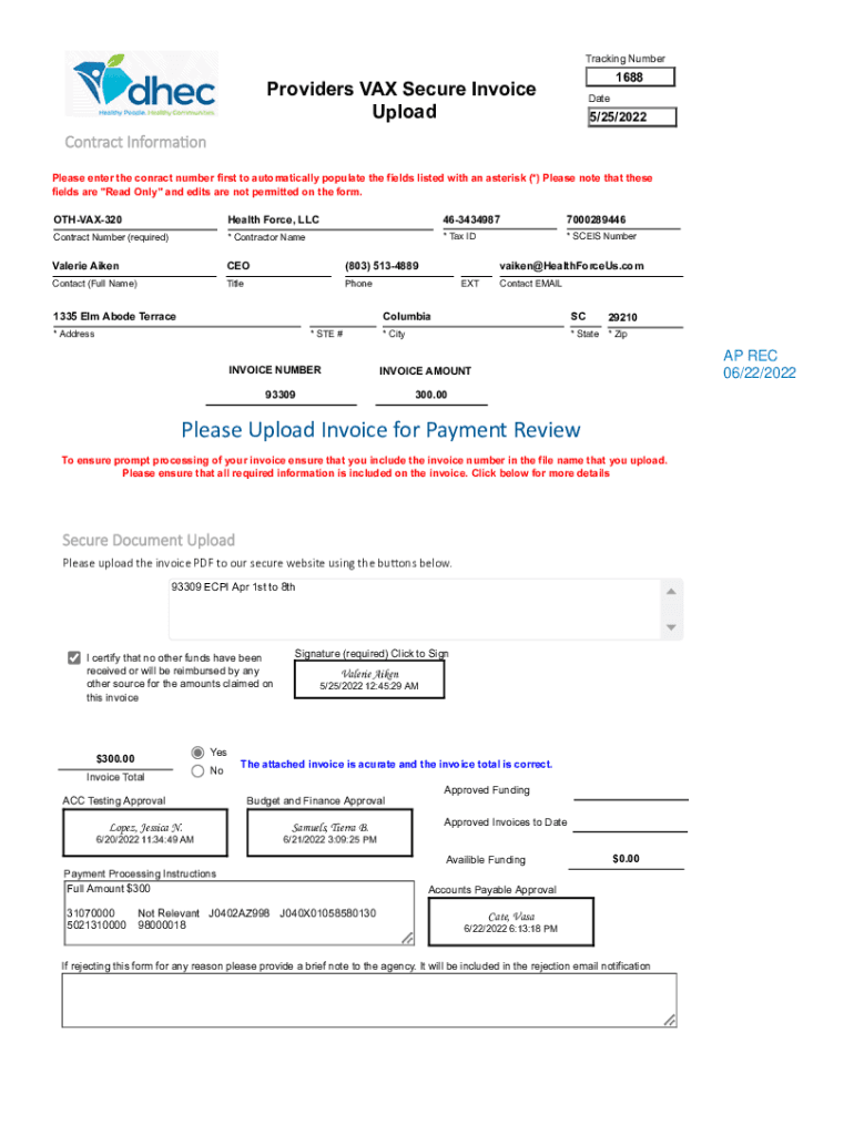 Tracking Number1688Providers VAX Secure InvoiceUploadDate5/25/2022Contract Information Please enter the contract number first to automatically populate the fields listed with an asterisk (*) Please