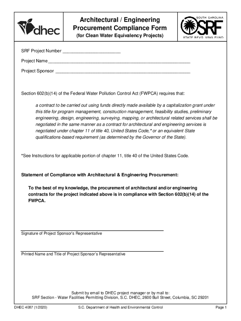 Architectural / Engineering Procurement Compliance Form (for Clean Water Equivalency Projects) SRF Project Number ___ Project Name ___ Project Sponsor ___Section 602(b)(14) of the Federal Water Pollution