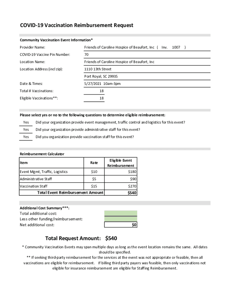 COVID-19 Vaccination Reimbursement Request Community Vaccination Event Information* Provider Name:Friends of Caroline Hospice of Beaufort, Inc (In.COVID-19 Vaccine Pin:70Location Name:Friends of Caroline
