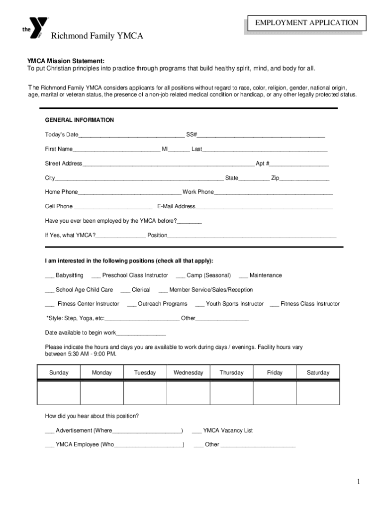 EMPLOYMENT APPLICATION Richmond Family YMCA Mission Statement: To put Christian principles into practice through programs that build healthy spirit, mind, and body for all. The Richmond Family YMCA