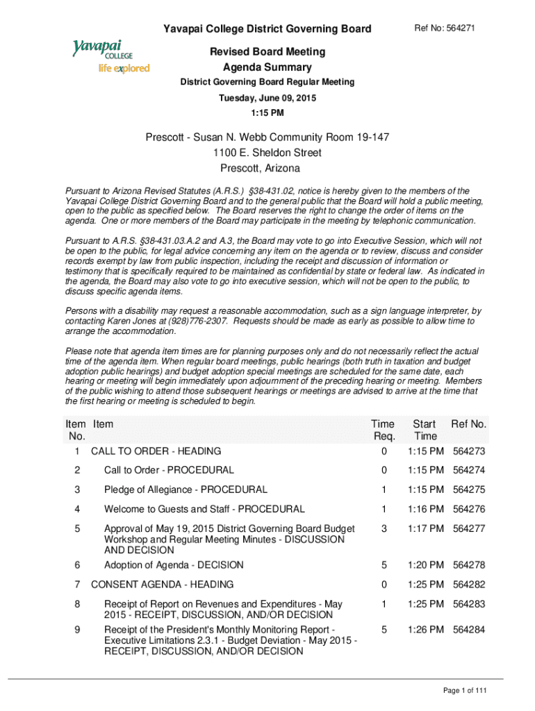 Ref No: 564271Yavapai College District Governing Board Revised Board Meeting Agenda Summary District Governing Board Regular Meeting Tuesday, June 09, 2015 1:15 PM Prescott Susan N. Webb Community