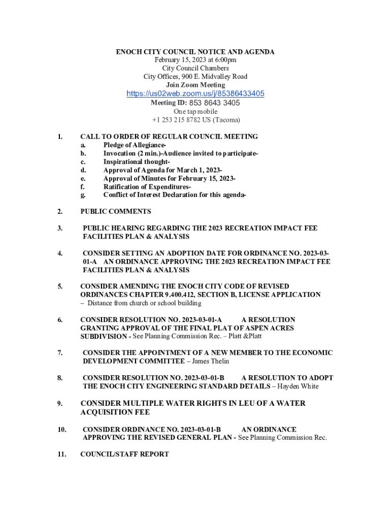 ENOCH CITY COUNCIL NOTICE AND AGENDA February 15, 2023, at 6:00pm City Council Chambers City Offices, 900 E. Midvalley Road Join Zoom Meetinghttps://us02web.zoom.us/j/85386433405 Meeting ID: 853 8643