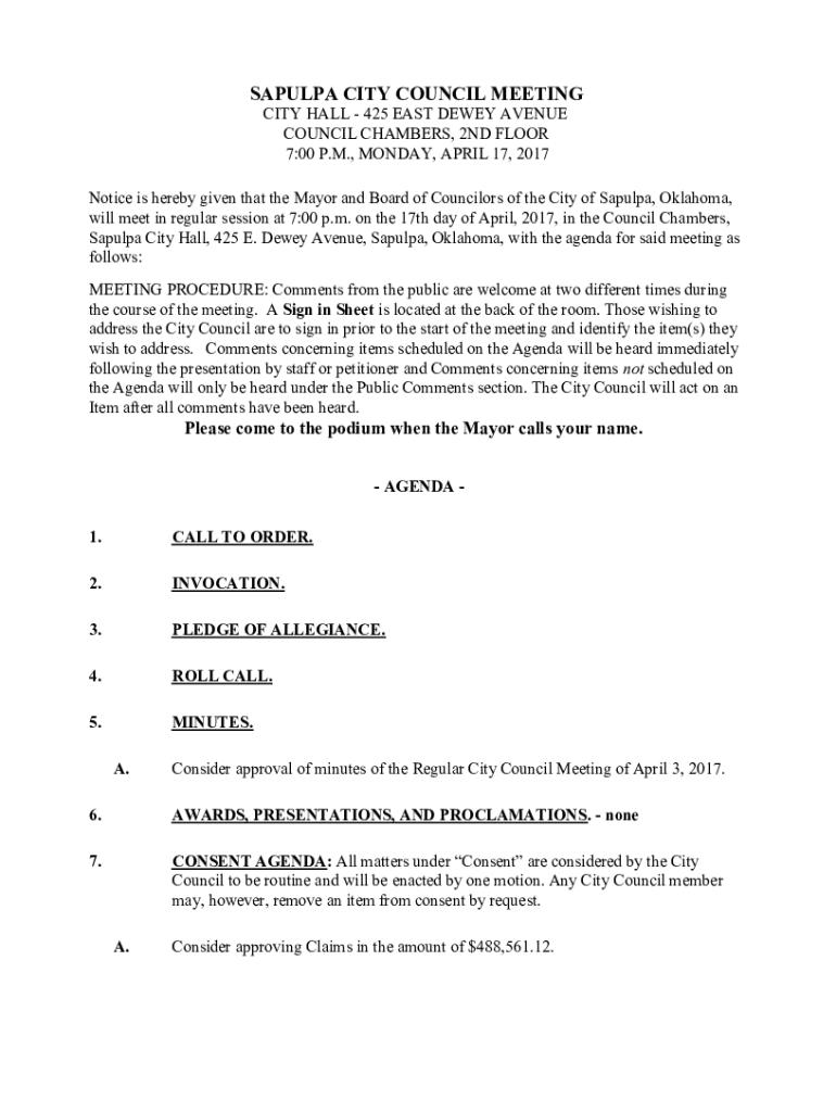 SAPULPA CITY COUNCIL MEETING CITY HALL 425 EAST DEWEY AVENUE COUNCIL CHAMBERS, 2ND FLOOR 7:00 P.M., MONDAY, APRIL 17, 2017, Notice is hereby given that the Mayor and Board of Councilors of the City