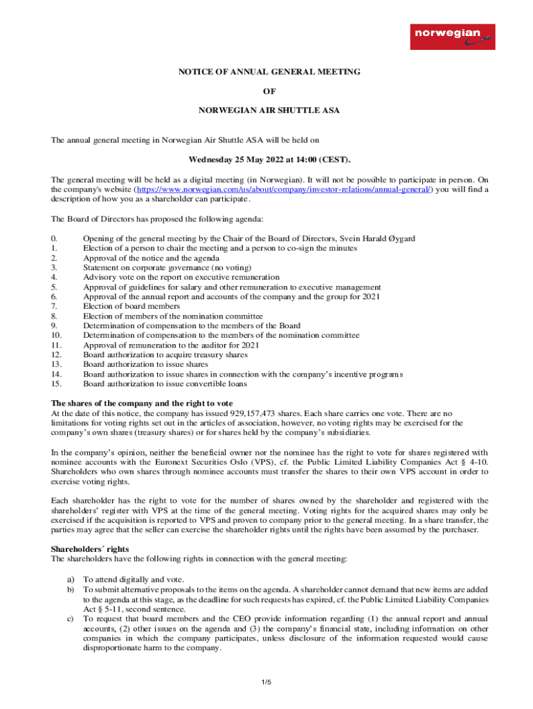 NOTICE OF ANNUAL GENERAL MEETING OF NORWEGIAN AIR SHUTTLE Agathe annual general meeting in Norwegian Air Shuttle ASA will be held on Wednesday 25 May 2022 at 14:00 (CEST). The general meeting will