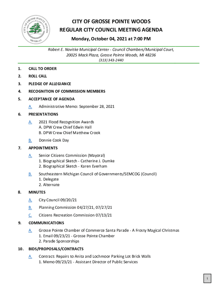 CITY OF GROSS POINT WOODS REGULAR CITY COUNCIL MEETING AGENDA Monday, October 04, 2021, at 7:00 PM Robert E. Novice Municipal Center Council Chambers/Municipal Court, 20025 Mack Plaza, Gross Point
