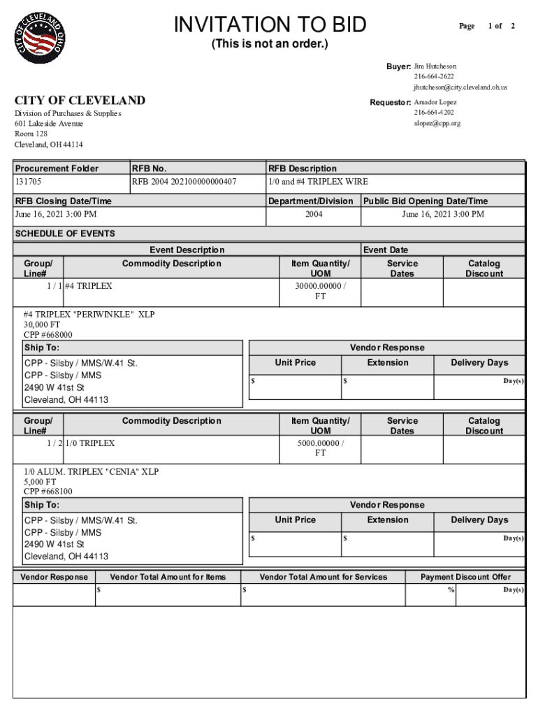 INVITATION TO BIDPage1 of2(This is not an order.) Buyer: Jim Hutches on 2166642622 jhutcheson@city.cleveland.oh.usCITY OF CLEVELANDRequestor: Amado Lopez 2166644202 alopez@cpp.orgDivision of Purchases