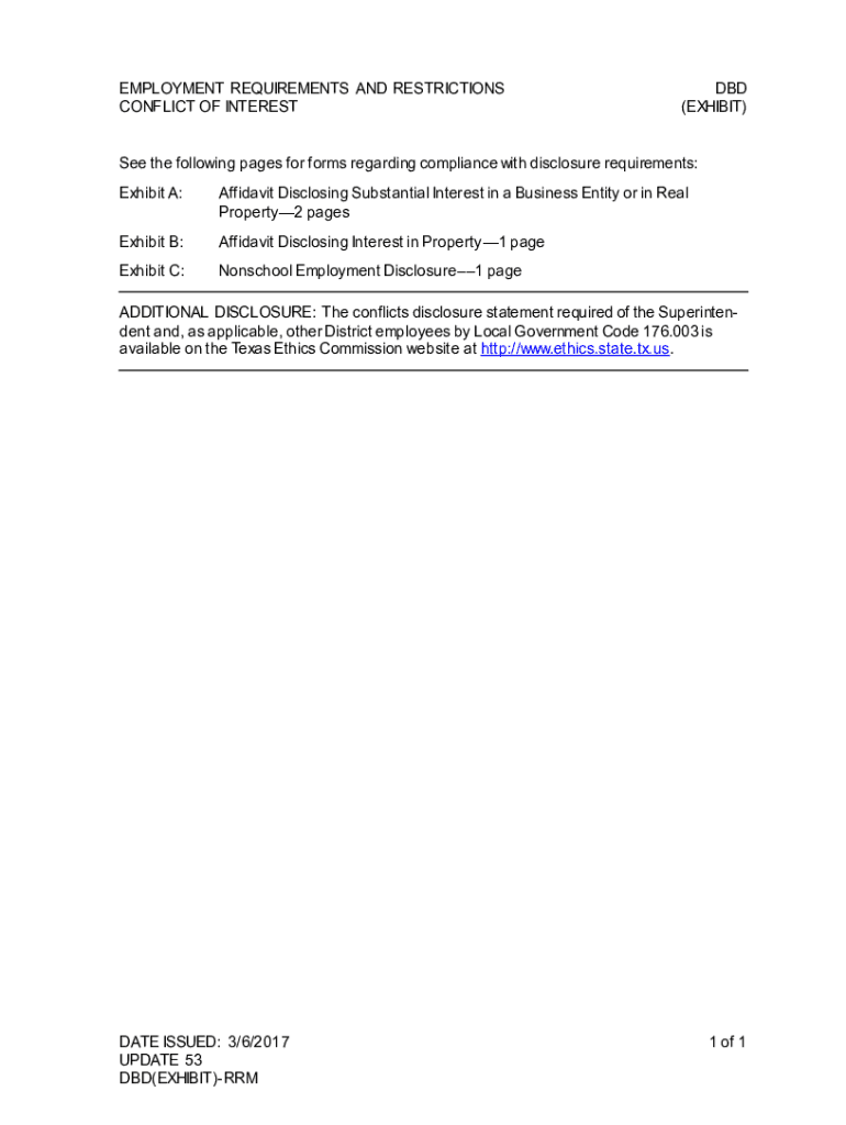 EMPLOYMENT REQUIREMENTS AND RESTRICTIONS CONFLICT OF INTEREST DBD (EXHIBIT)See the following pages for forms regarding compliance with disclosure requirements: Exhibit A:Affidavit Disclosing Substantial