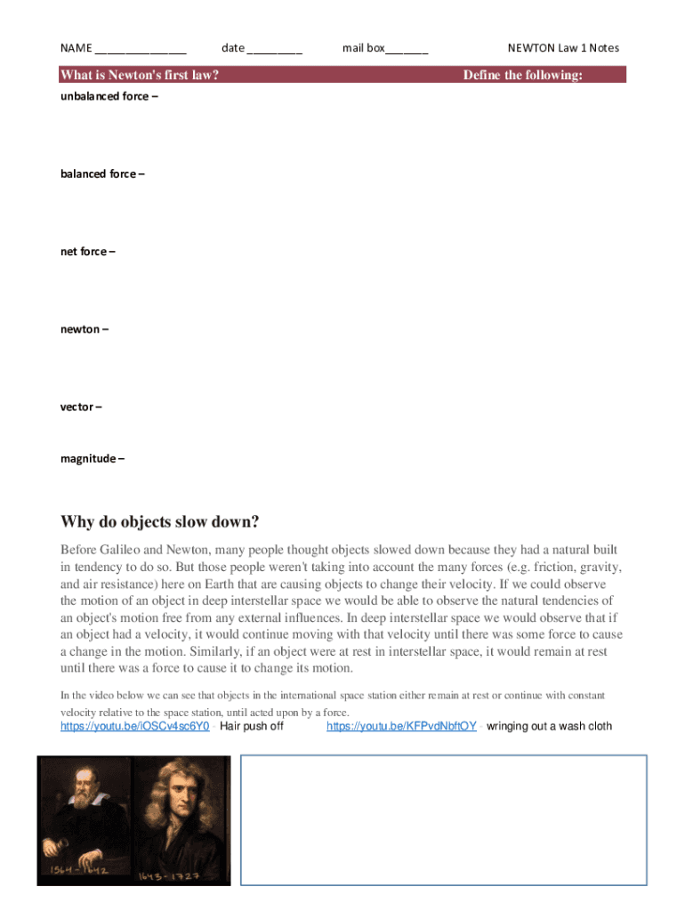 NAME ___date ___What is Newton\'s first law?mail box___NEWTON Law 1 NotesDefine the following:unbalanced force balanced force net force newton vector magnitude Why do objects slow down? Before Galileo
