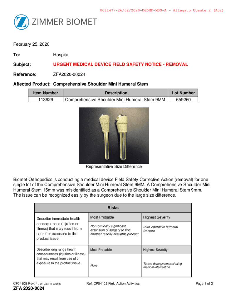 To:HospitalSubject:URGENT MEDICAL DEVICE FIELD SAFETY NOTICE REMOVALReference:ZFA202000024Affected Product: Comprehensive Shoulder