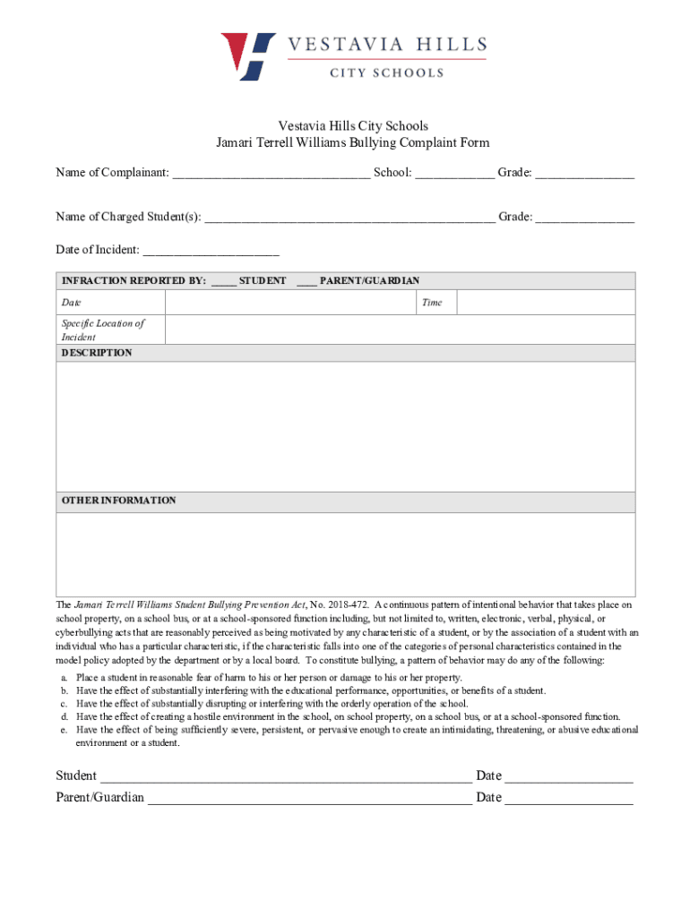Vestavia Hills City Schools Jamar Terrell Williams Bullying Complaint Form Name of Complainant: ___ School: ___ Grade: ___ Name of Charged Student(s): ___ Grade: ___ Date of Incident: ___ INFRACTION