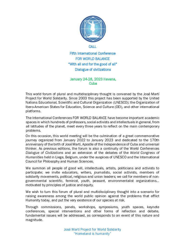 CALL Fifth International Conference FOR WORLD BALANCE With all and for the good of all Dialogue of civilizations January 2428, 2023 Havana, Cuba This world forum of plural and multidisciplinary thought