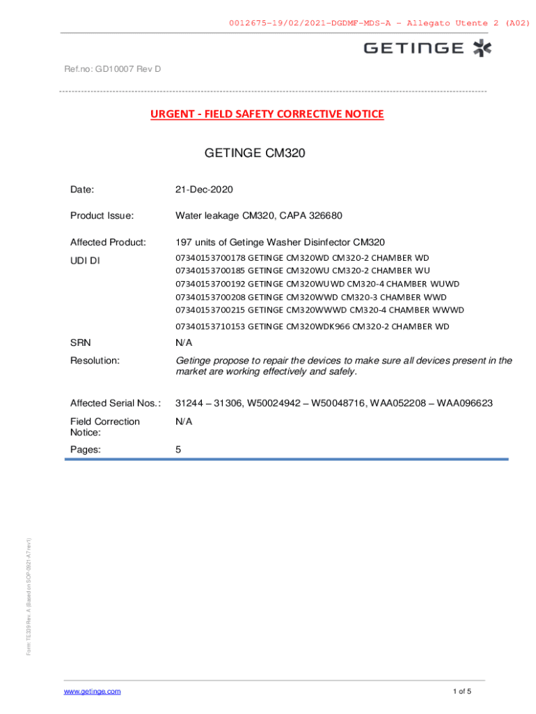 001267519/02/2021DGDMFMDSA Allegato Tenth 2 (A02)Ref.no: GD10007 Rev URGENT FIELD SAFETY CORRECTIVE NOTICE GETTING CM320 Date:21Dec2020Product Issue:Water leakage CM320, CAP 326680Affected Product:197