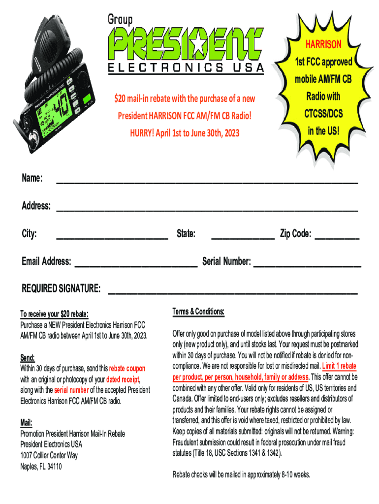 $20 mailing rebate with the purchase of a new President HARRISON FCC AM/FM CB Radio! HURRY! April 1st to June 30th, 2023Name:HARRISON 1st FCC approved mobile AM/FM CB Radio with CT CSS/DCS in the