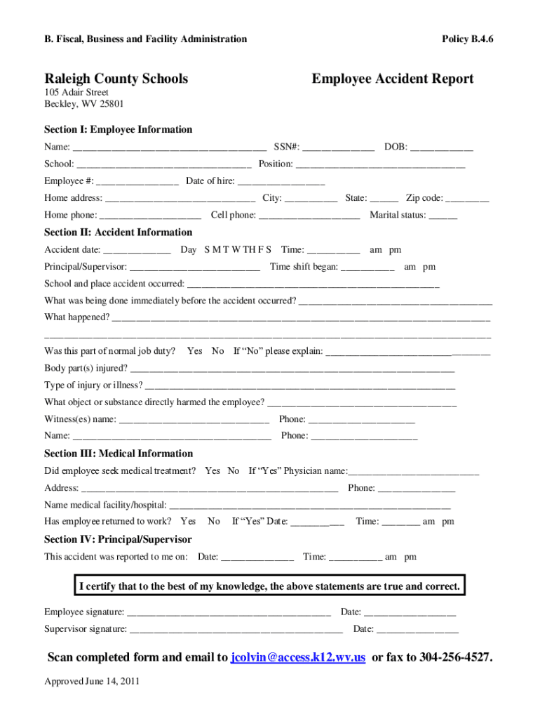 B. Fiscal, Business and Facility Administration Raleigh County SchoolsPolicy B.4.6Employee Accident Report105 Aware Street Beckley, WV 25801Section I: Employee Information Name: ___ SSN#: ___ DOB: