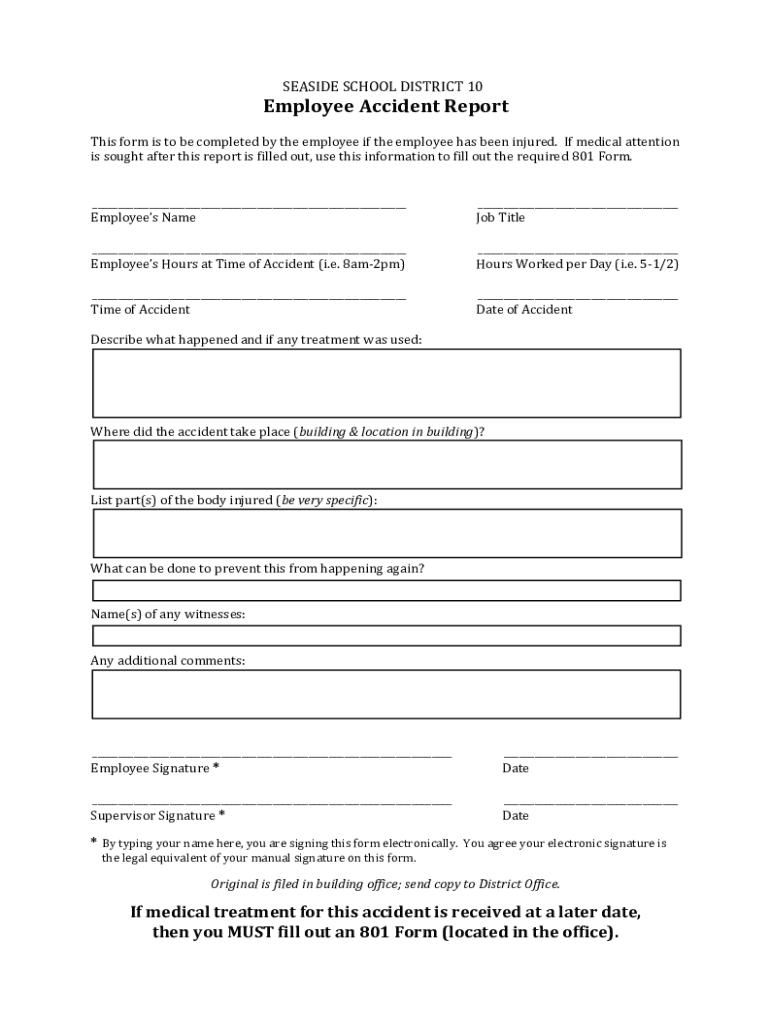 SEASIDE SCHOOL DISTRICT 10Employee Accident Report This form is to be completed by the employee if the employee has been injured. If medical attention is sought after this report is filled out, use