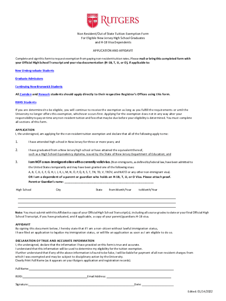 Non-Resident/Out of State Tuition Exemption Form For Eligible New Jersey High School Graduates and H1B Visa Dependents APPLICATION AND AFFIDAVIT Complete and sign this form to request exemption from