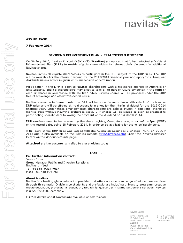 For personal use only ASX RELEASE 7 February 2014 DIVIDEND REINVESTMENT PLAN FY14 INTERIM DIVIDEND On 30 July 2013, Navies Limited (ASX:NVT) (Navies) announced that it had adopted a Dividend Reinvestment