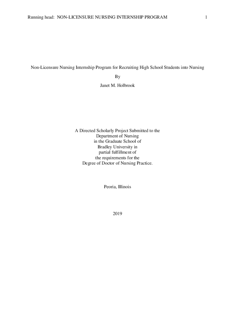 Running head: LICENSURE NURSING INTERNSHIP PROGRAMNonLicensure Nursing Internship Program for Recruiting High School Students into Nursing By Janet M. Holbrook Directed Scholarly Project Submitted