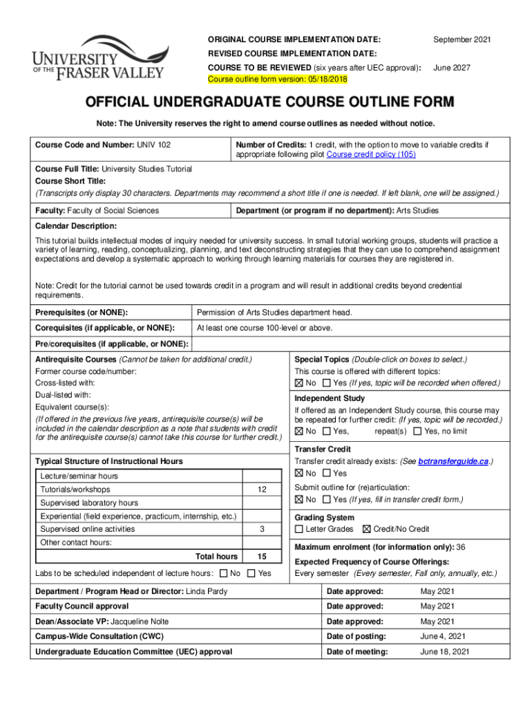 ORIGINAL COURSE IMPLEMENTATION DATE:September 2021REVISED COURSE IMPLEMENTATION DATE: COURSE TO BE REVIEWED (six years after UEC approval): Course outline form version: 05/18/2018June 2027OFFICIAL