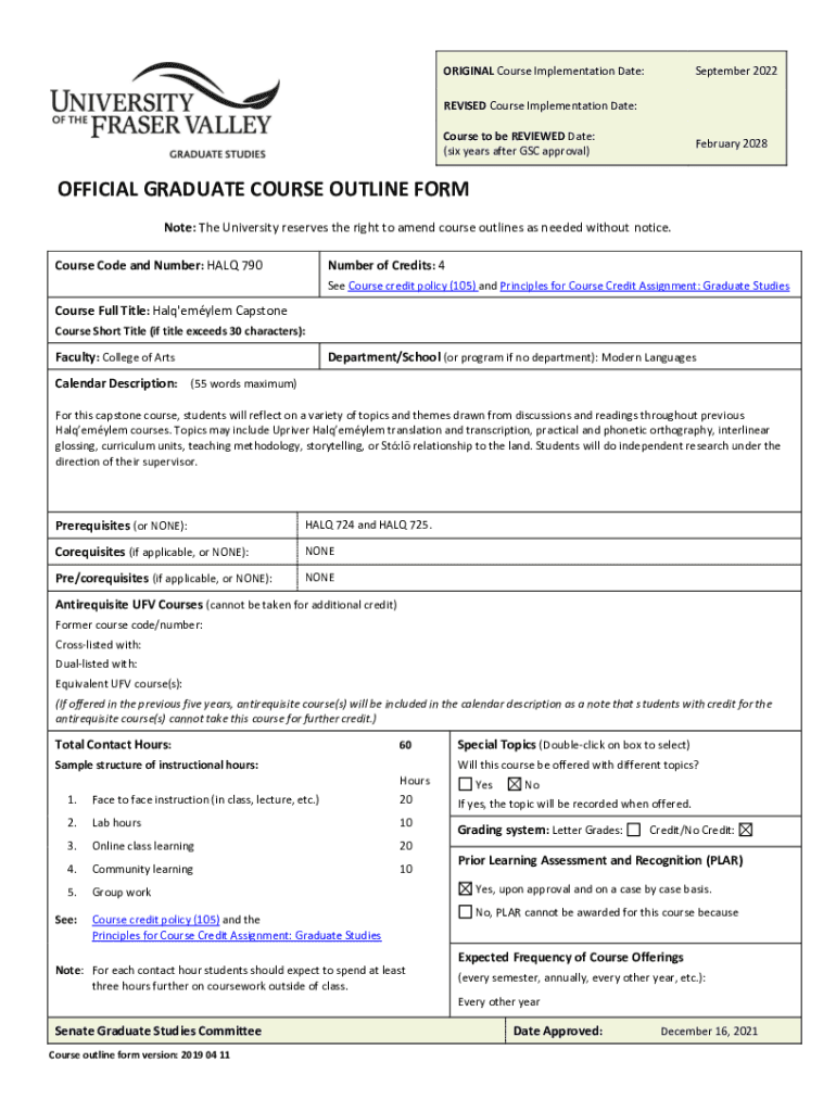 ORIGINAL Course Implementation Date:September 2022REVISED Course Implementation Date: Course to be REVIEWED Date: (six years after GSC approval)February 2028OFFICIAL GRADUATE COURSE OUTLINE FORM Note: