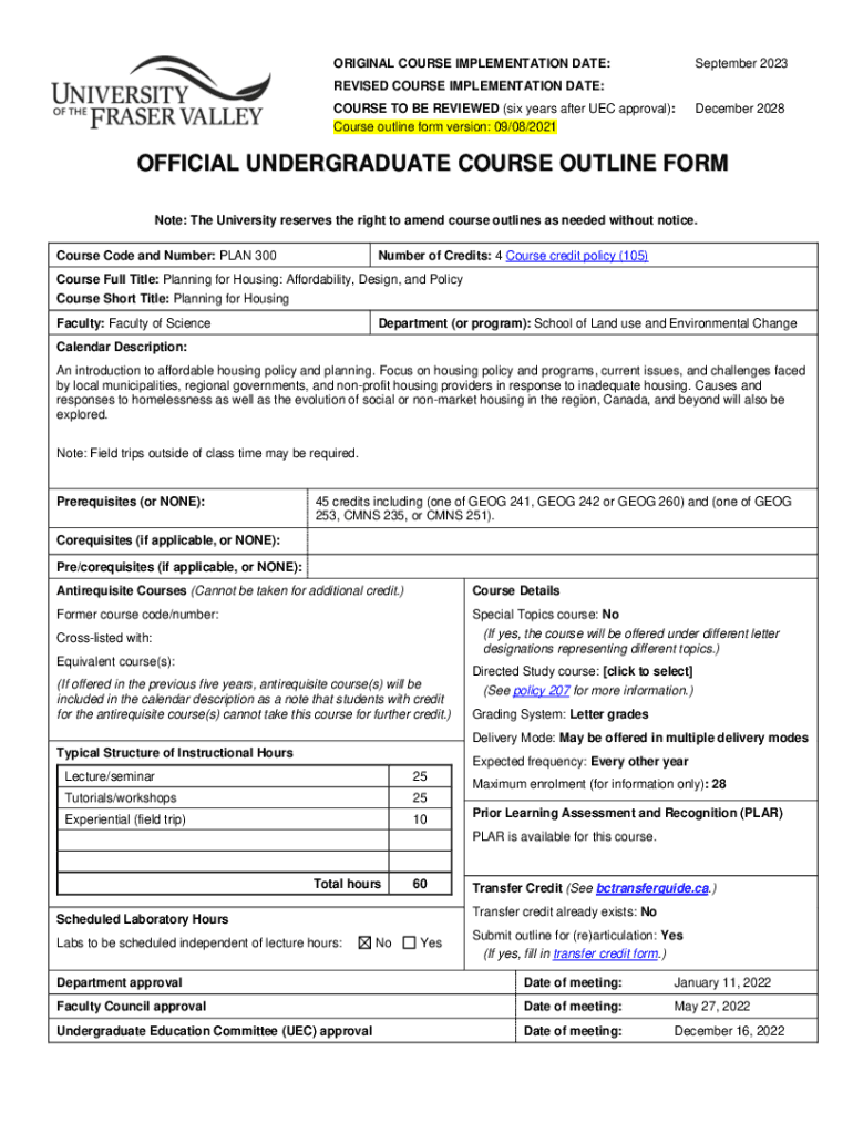 ORIGINAL COURSE IMPLEMENTATION DATE:September 2023REVISED COURSE IMPLEMENTATION DATE: COURSE TO BE REVIEWED (six years after UEC approval): Course outline form version: 09/08/2021December 2028OFFICIAL