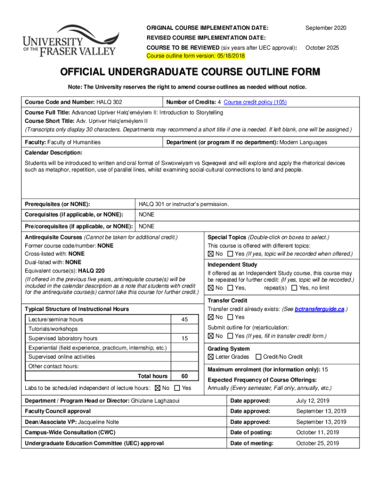 ORIGINAL COURSE IMPLEMENTATION DATE:September 2020REVISED COURSE IMPLEMENTATION DATE: COURSE TO BE REVIEWED (six years after UEC approval): Course outline form version: 05/18/2018October 2025OFFICIAL