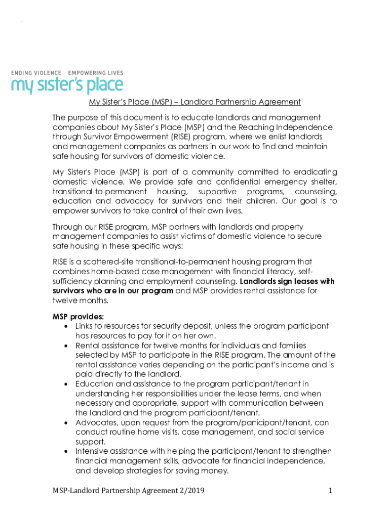 My Sisters Place (MAP) Landlord Partnership Agreement The purpose of this document is to educate landlords and management companies about My Sisters Place (MAP) and the Reaching Independence through