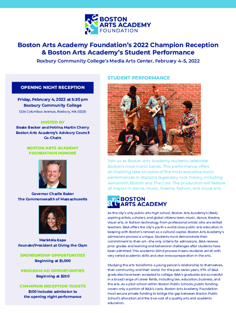 Boston Arts Academy Foundations 2022 Champion Reception & Boston Arts Academies Student Performance Roxbury Community Colleges Media Arts Center, February 45, 2022 STUDENT PERFORMANCE OPENING NIGHT