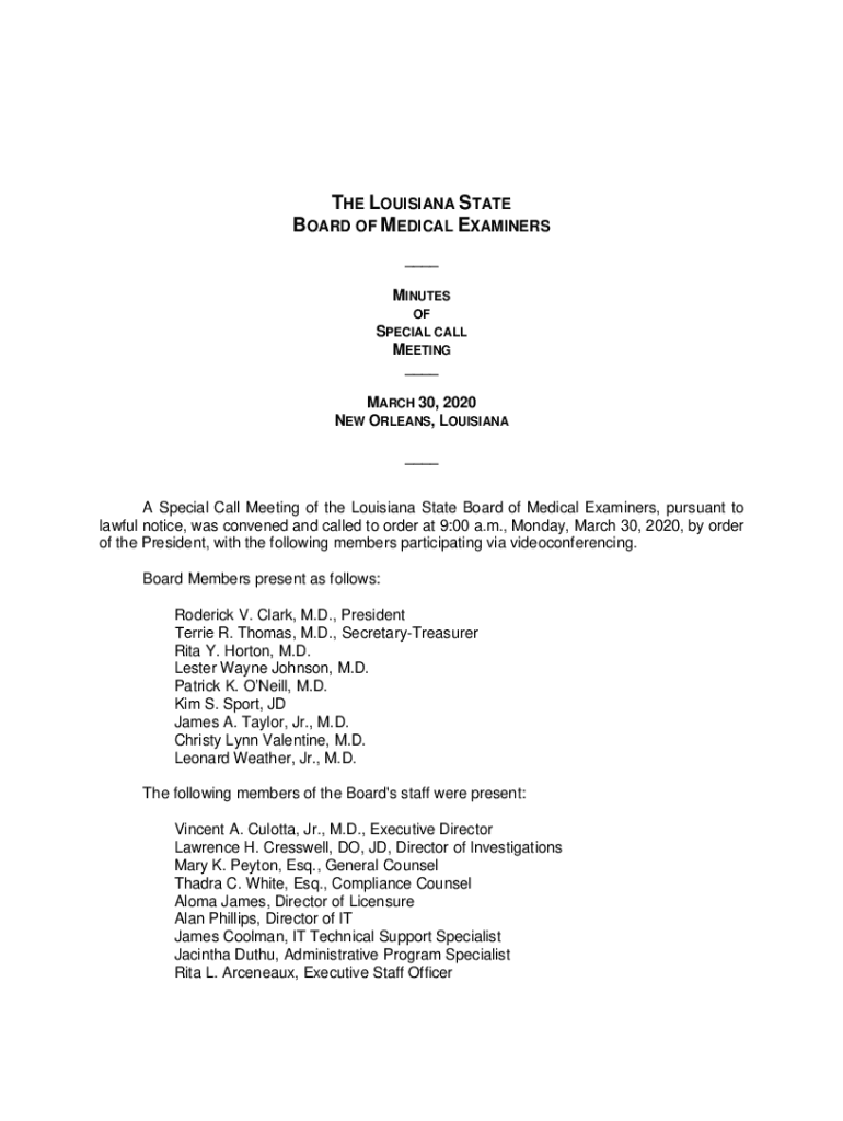 THE LOUISIANA STATE BOARD OF MEDICAL EXAMINERS ___ MINUTES SPECIAL CALL MEETING ___ MARCH 30, 2020, NEW ORLEANS, LOUISIANA ___ A Special Call Meeting of the Louisiana State Board of Medical Examiners,