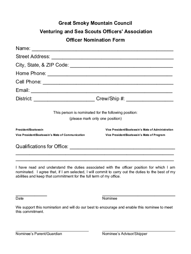 April 21, 2022, Dear Ventures, Sea Scouts, Advisors, and Skippers: The Great Smoky Mountain Council invites nominations for eligible Ventures and Sea Scouts to serve as officers for the Councils Venturing
