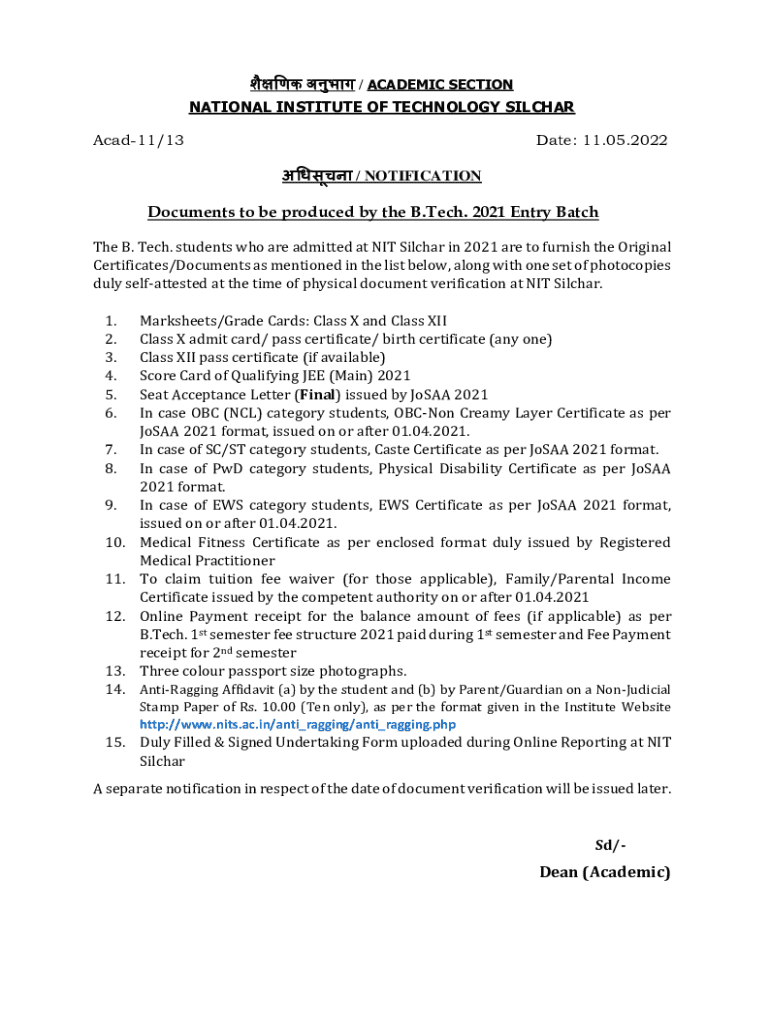 / ACADEMIC SECTION NATIONAL INSTITUTE OF TECHNOLOGY PILCHARD Acad11/13Date: 11.05.2022 / NOTIFICATION Documents to be produced by the B. Tech. 2021 Entry Batch The B. Tech. Students who are admitted