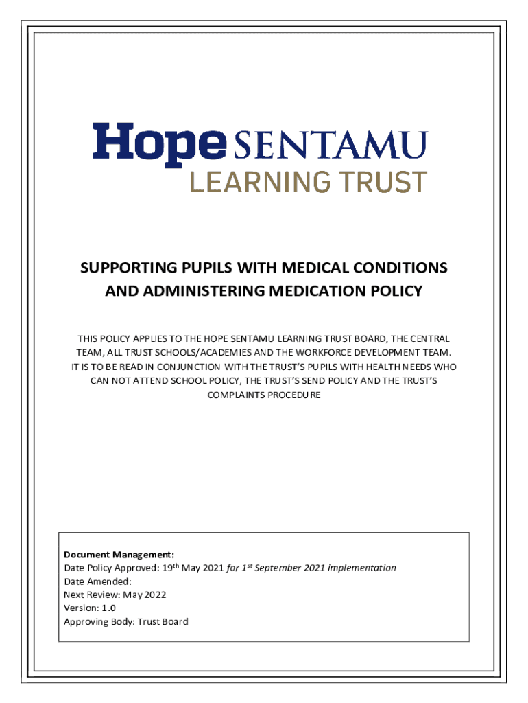SUPPORTING PUPILS WITH MEDICAL CONDITIONS AND ADMINISTERING MEDICATION POLICY THIS POLICY APPLIES TO THE HOPE SENT AMU LEARNING TRUST BOARD, THE CENTRAL TEAM, ALL TRUST SCHOOLS/ACADEMIES AND THE WORKFORCE