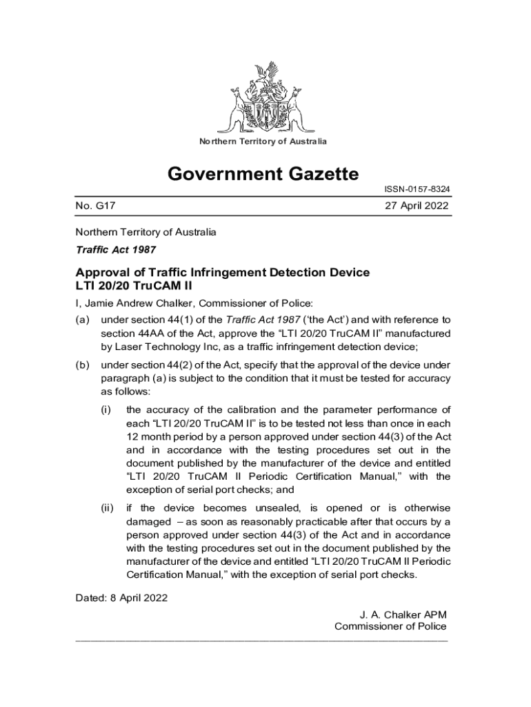 Northern Territory of AustraliaGovernment Gazette No. G17ISSN0157832427 April 2022Northern Territory of Australia Traffic Act 1987Approval of Traffic Infringement Detection Device LTI 20/20 Truck