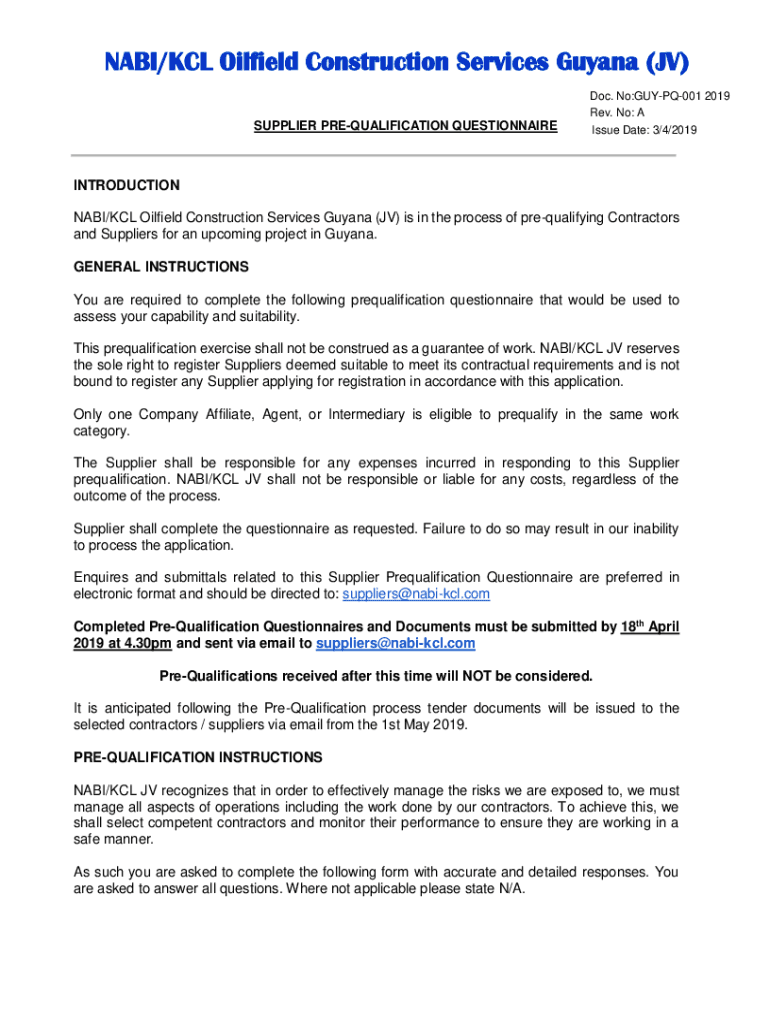 NAZI/KCL Oilfield Construction Services Guyana (JV) SUPPLIER PREQUALIFICATION Questionnaire. No:GUYPQ001 2019 Rev. No: A Issue Date: 3/4/2019INTRODUCTION NAZI/KCL Oilfield Construction Services Guyana