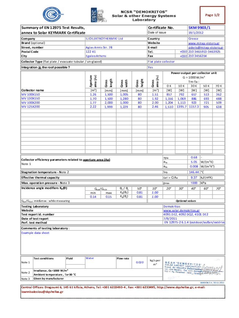 Page 1/2Summary of EN 12975 Test Results, annex to Solar DENMARK Certificate Company Brand (optional) Street, number Postal Code CityILIOILEKTROTHERMIKI Certificate No. KM 9903/1Date of issue19/1/2012