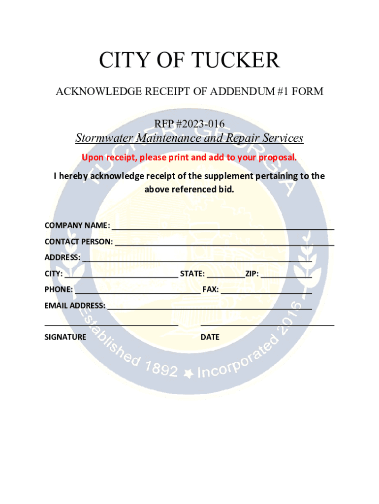 CITY OF TUCKER ACKNOWLEDGE RECEIPT OF ADDENDUM #1 FORM RFP #2023016Stormwater Maintenance and Repair Services Upon receipt, please print and add to your proposal. I hereby acknowledge receipt of the